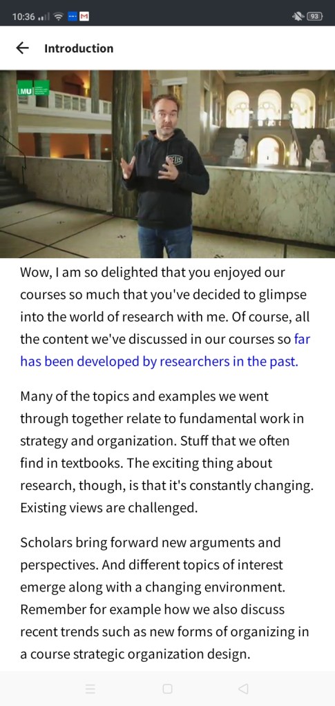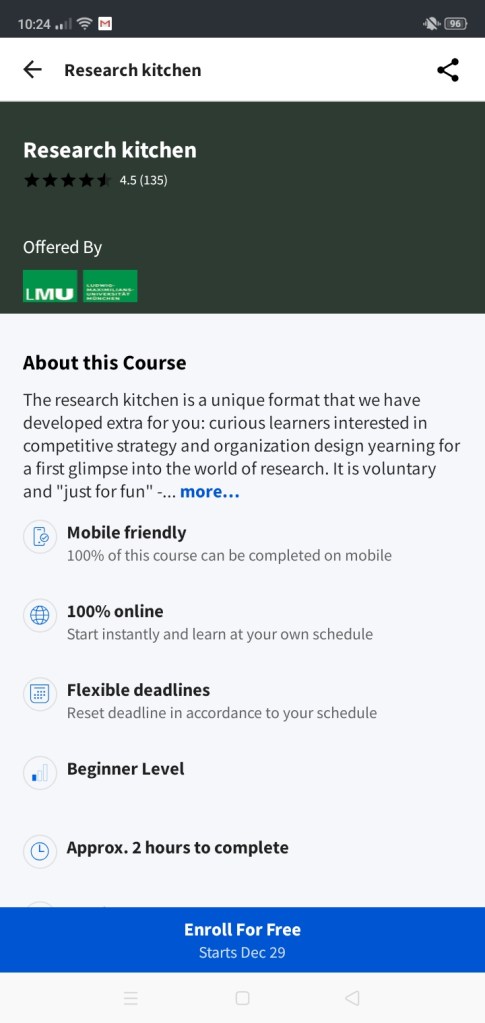 First thing I did I opened Coursera the platform of MOOC and signed up with my Google account, then after signed in I explored the courses of Coursera and there are many courses like Art’s and Humanities, Business, Computer Science and etc. and you can also research the course that you want to enroll, and I researched Cooking because I love cooking when I was a child until now, so after that I chosen the Research Kitchen because that’s the only one course with free enrollmet I’ve seen, and we all 4.7k students in Research Kitchen, in Research Kitchen course you will experience the professor Tobias Kretschmer at the white board of his very own institute at LMU Munich. He will summarize key findings of recent research papers on topics relating to the three courses Competitive strategy, Advanced Competitive strategy and Strategic Organization Design. Research Kitchen starting enrollment December 29, 2022 and that day I enrolled and joined the course successfully, after I joined I also watched and read the introduction of professor Tobias Kretschmer and I have nine assignments to answer to pass the course and you can set your goal and time and then continue learning the course and gain Knowledge about cooking and that’s what I had experienced.